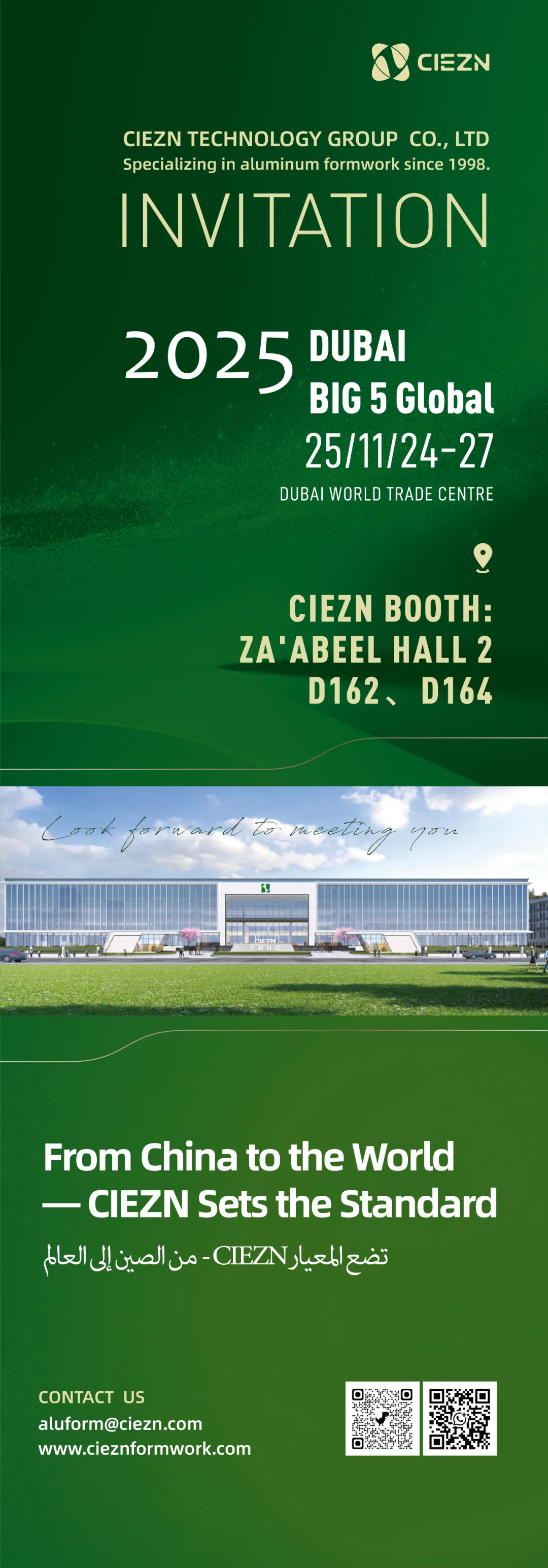 2025年11月25日至27日,鑫政将远赴阿联酋迪拜,亮相全球建筑业界瞩目的2025年迪拜五大行业展(The Big 5 Dubai)。在迪拜世贸中心的聚光灯下,在Za'abeel Hall 2的D162、D164展位,向全球客户展示鑫政在智慧建造、绿色建材及一体化解决方案领域的最新成果。